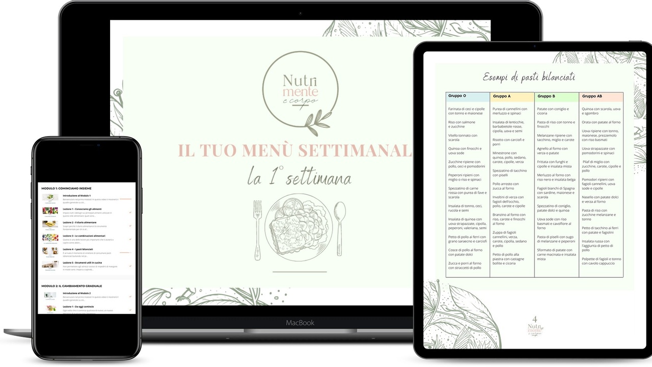 • 4 moduli da implementare + 4 BONUS super esclusivi: con tutto ciò che devi sapere per mangiare in modo sano, senza glutine, senza latticini e secondo la dieta dei gruppi sanguigni